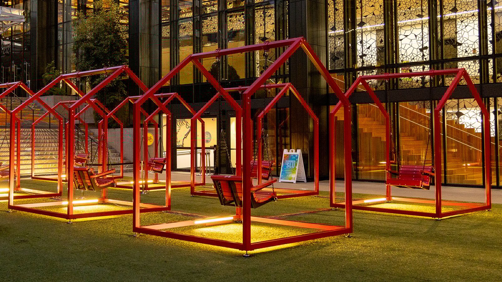 Created by Esrawe + Cadena, Mi Casa, Your Casa 2.0 is inspired by the mercados of Latin America, lively street markets where human connections are made every day. The interactive installation features a series of three-dimensional red frames illustrating the warmth and comfort of home. The small houses (casas) serve as a blank canvas for community engagement and playful socialization, while the swings inside invite passersby to relax and sway at their leisure. When a casa is empty, a welcoming white glow bids you to enter. Once inside, the glow intensifies to show that someone is home.